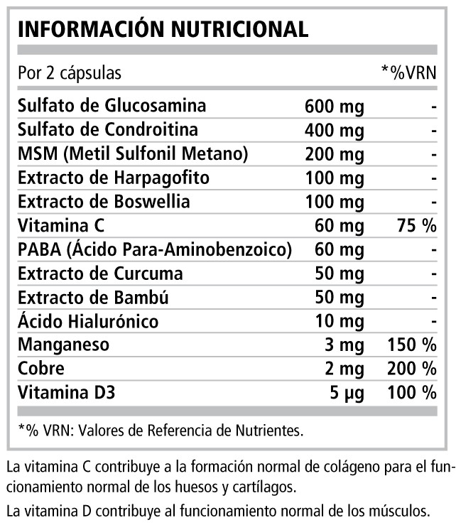 JOINT SUPPORT contiene Sulfato de Glucosamina y Sulfato de Condroitina. El Sulfato de Glucosamina favorece la regeneración del cartílago y la mejor hidratación de la articulación, un cartílago fino y poco hidratado puede dar lugar a dolores fruto del desgaste y de la presión de los nervios internos en la articulación. La presentación en forma de Sulfato es la más efectiva por encima de las demás. Por otra parte el Sulfato de Condroitina contribuye en la articulación a atraer el líquido sinovial, este es el mayor nutriente de las articulaciones y es capaz de llegar a las fisuras más profundas del cartílago y la articulación. También contribuye a inhibir las enzimas que provocan el desgaste del cartílago, proporcionando mejor salud y mas durabilidad del mismo.